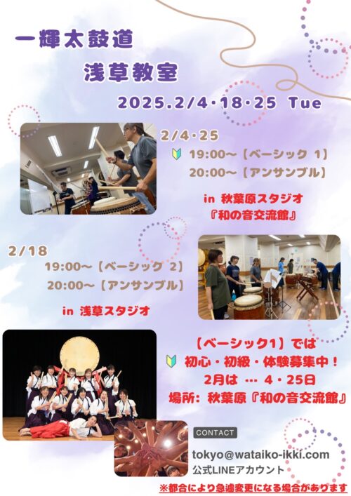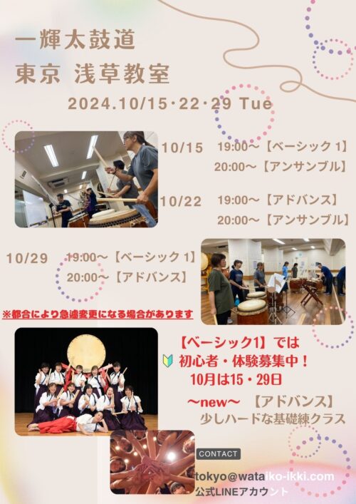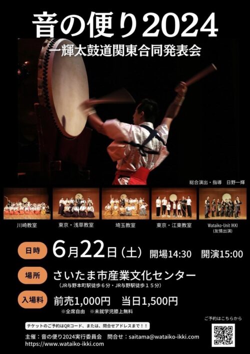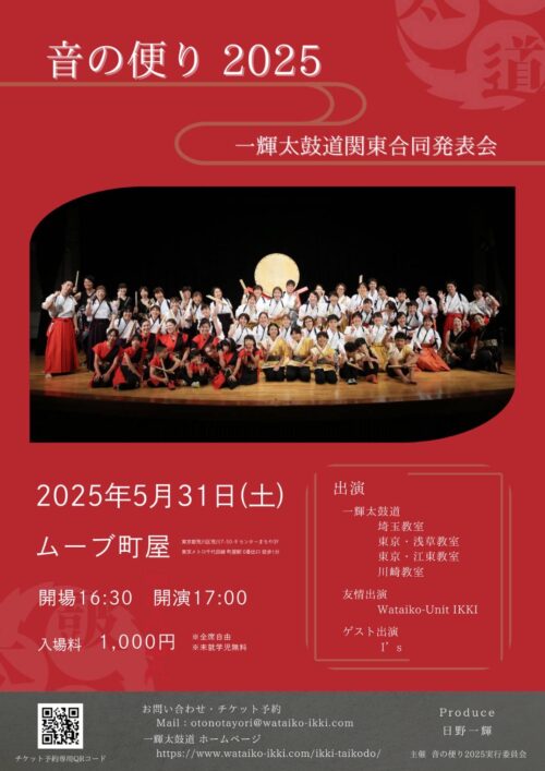 浅草教室8月の予定 2024 8/03 太鼓教室 2024年8月3日 お問い合わせ 一輝太鼓道東京事務局 担当:木原 tokyo@wataiko-ikki.com 太鼓教室 一輝太鼓道 初心者歓迎 和太鼓 太鼓で笑顔 日野一輝 浅草教室 よかったらシェアしてね! URLをコピーしました! URLをコピーしました! 音の便り2024(一輝太鼓道関東合同発表会)終了! 埼玉WSのお知らせ この記事を書いた人 日野 一輝 自衛隊で和太鼓と出会う。 2002年【太鼓衆一気 】を結成。 日本人初のウクライナ全土ツアー、3度の台湾ツアーや5年連続韓国フェス、イギリスのジャパンフェスタにも招待されるなど、世界16カ国100都市以上で演奏。 他にも、堤真一主演『写楽考』、堂本光一主演『Endless SHOCK』に出演。 株式会社スターダストプロモーションの「超特急」や『ジャニーズワールド』で太鼓指導。 世界最大芸術祭『Edinburgh Festival』で4つ星を2回取得。 詳しいプロフィールはこちら 関連記事 一輝太鼓道2026年発表会決定! 2025年11月3日 音の便り2025 関東合同発表会 2025年4月14日 浅草教室2月の予定 2025年1月20日 浅草教室10月の予定 2024年9月1日 埼玉WSのお知らせ 2024年8月28日 音の便り2024(一輝太鼓道関東合同発表会)終了! 2024年6月23日 音の便り2024(一輝太鼓道関東合同発表会) 2024年5月13日 浅草教室3月の予定 2024年2月28日 コメント コメントする コメントをキャンセルコメント ※ 名前 ※ メール ※ サイト 次回のコメントで使用するためブラウザーに自分の名前、メールアドレス、サイトを保存する。