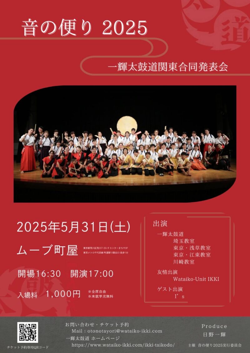今年も関東4教室による盛大な発表会を行います。現在この日のために生徒一同猛練習中!さらにゲストにはWataiko-Unit IKKIとI’sが出演。過去最大となる発表会、ぜひ和太鼓の迫力あるサウンドを聴きにきてください!2025年5月31日(土)ムーブ町屋開場16:3... -