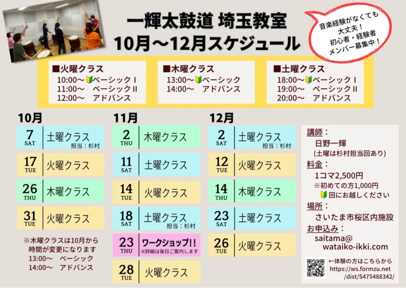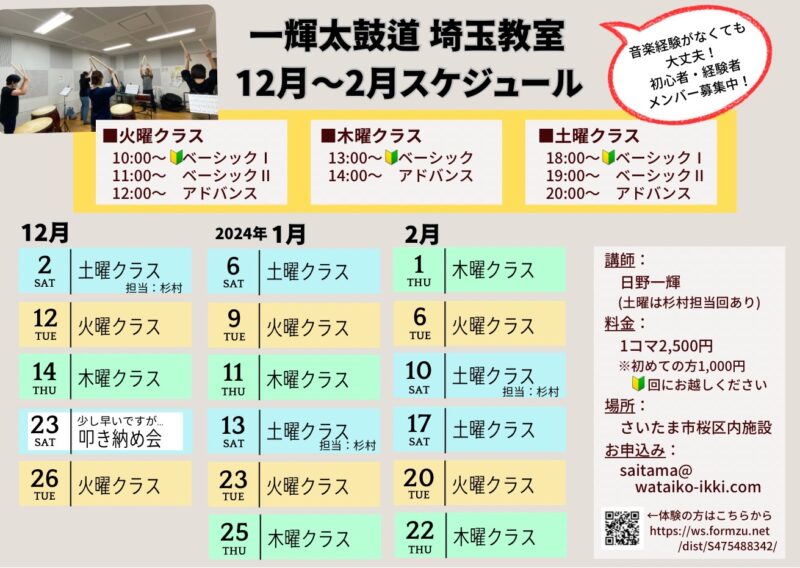 お問い合わせ 一輝太鼓道埼玉教室事務局 担当:杉村 saitama@wataiko-ikki.com -