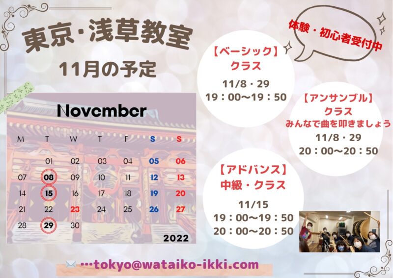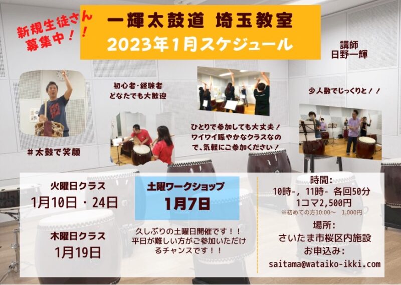 お問い合わせ 一輝太鼓道埼玉教室事務局 担当:杉村 saitama@wataiko-ikki.com -